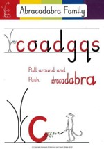 The magician teaches Scared Monkey the magic trick. He shows him that for each of the letters, he can pull around to write c, shout 'Abracadabra' and then magic it into o, a, d, g, q, or s.