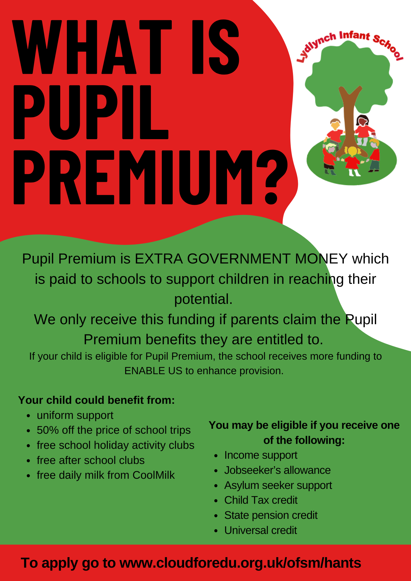 Although Infant aged children currently qualify for free school dinners through the Universal Infant Free School meals scheme, when they transfer to Junior school, charges are made for school lunches, unless children are eligible for income-based free school meals, so apply now rather than later.