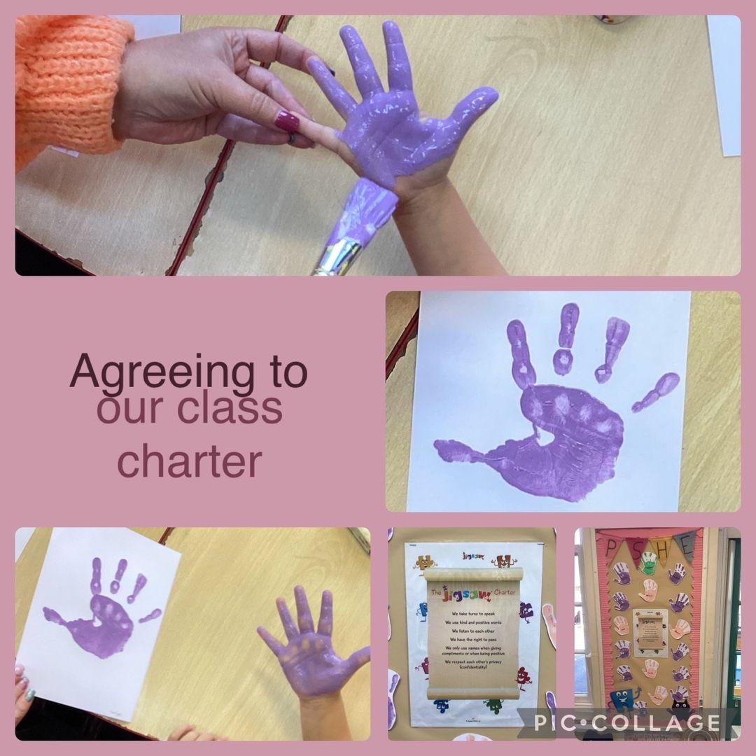 We've had an amazing first week in school together settling in, learning new routines and school rules. We all signed our Class Charter with our hand prints.