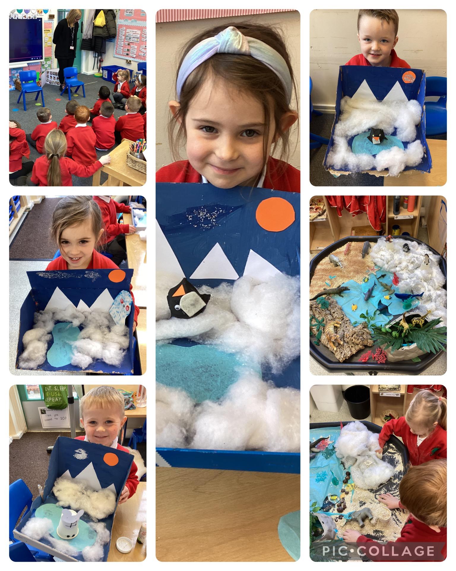 This week we completed our winter boxes, making a habitat for our animals. We discussed how animals adapt to their different habitats and explored the different habitats in which animals might belong. We have been discussing positional language, and we wrote about, or labelled our winter boxes.