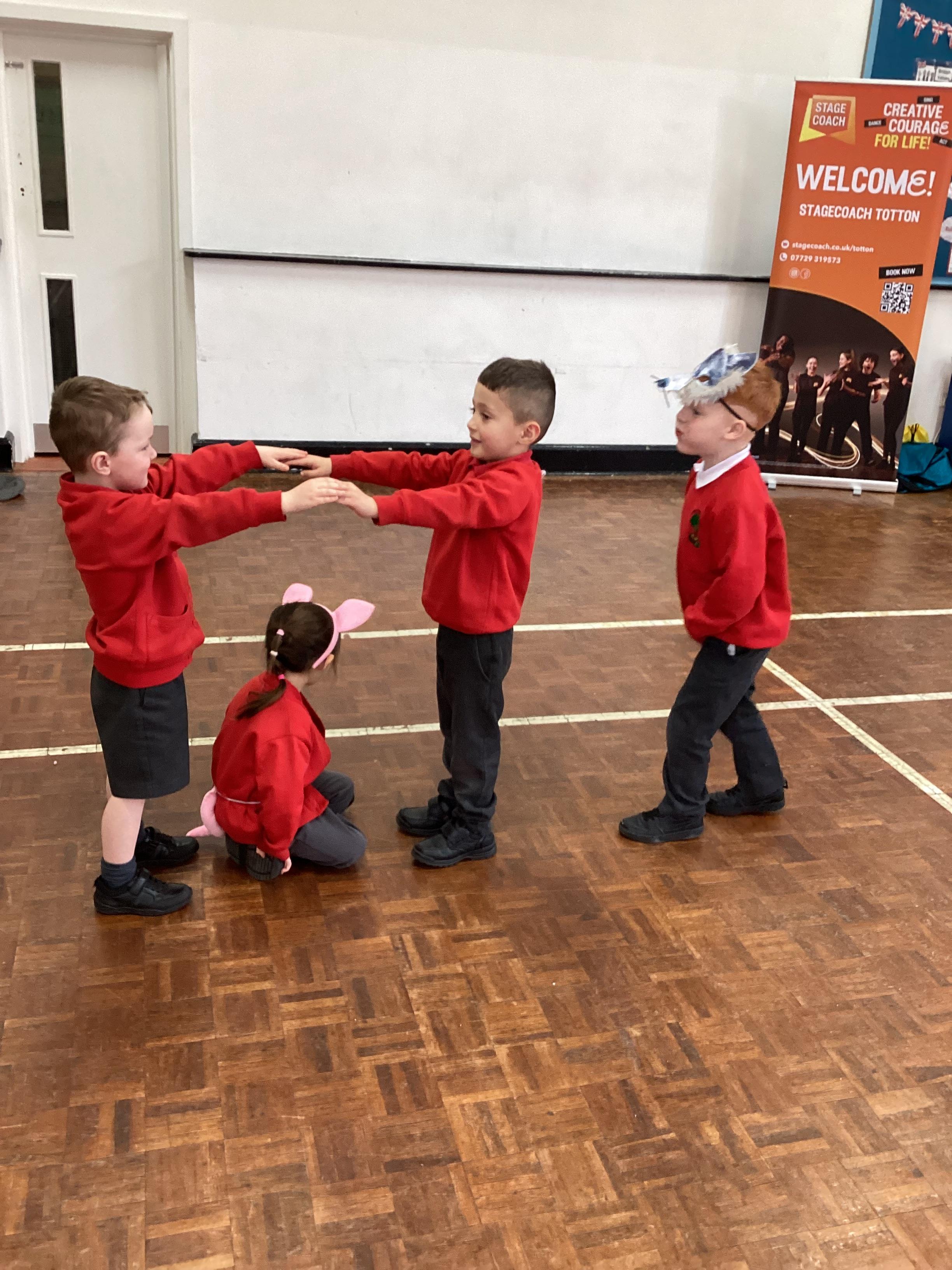Year R have begun their new topic, 'Tell us a story' and have been exploring the Three Little Pigs. We have been busy building houses with straw, sticks, and bricks to see if they blow down. Rabbits and Owls were very lucky to have Stagecoach visit us and we got to act, sing and dance the story. Well done!